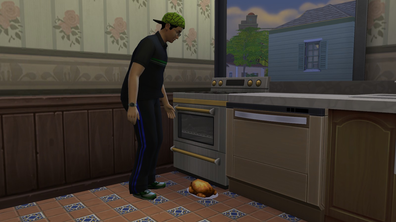 Really, he cooks a chicken and sets it on the floor when the counter's LITERALLY RIGHT THERE, lol.